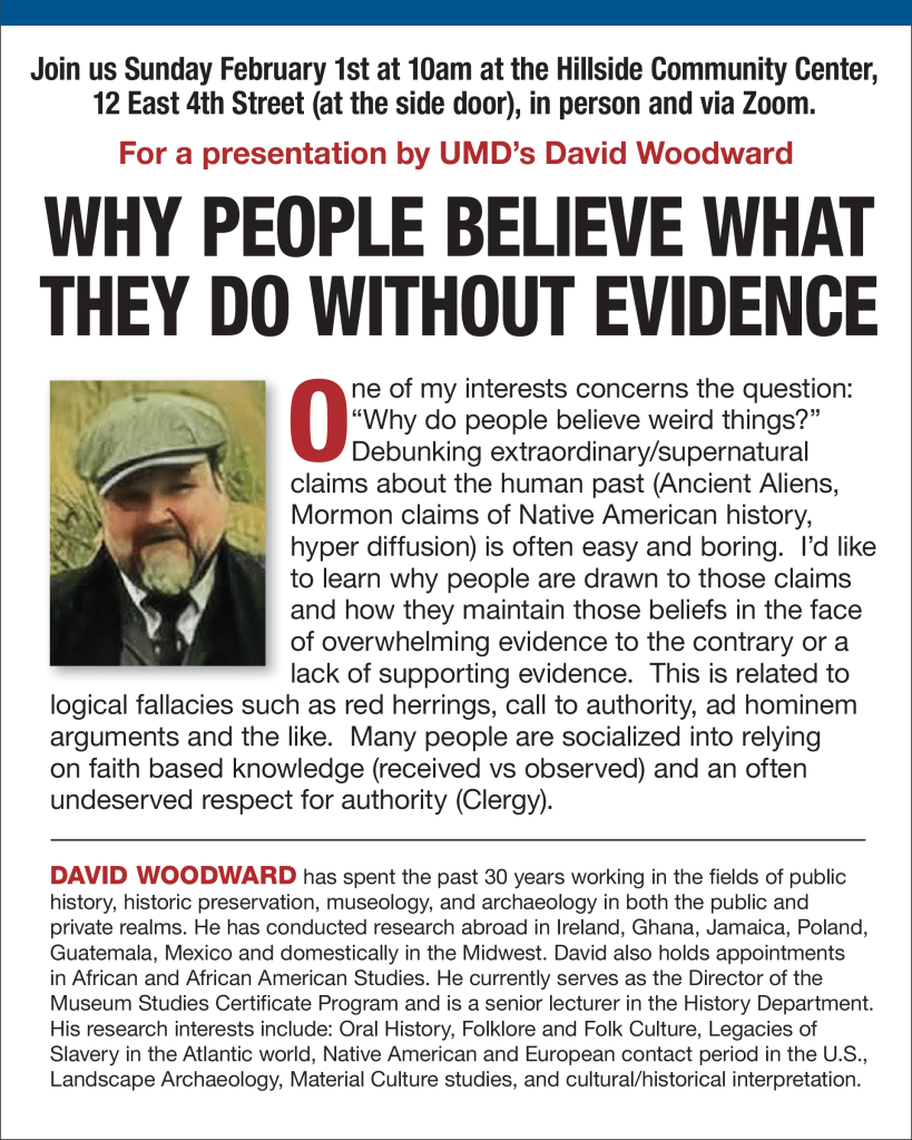 One of my interests concerns the question: “Why do people believe weird things?” Debunking extraordinary/supernatural claims about the human past (Ancient Aliens, Mormon claims of Native American history, hyper diffusion) is often easy and boring. I’d like to learn why people are drawn to those claims and how they maintain those beliefs in the face of overwhelming evidence to the contrary or a lack of supporting evidence. This is related to logical fallacies such as red herrings, call to authority, ad hominem arguments and the like. Many people are socialized into relying on faith based knowledge (received vs observed) and an often undeserved respect for authority (Clergy).